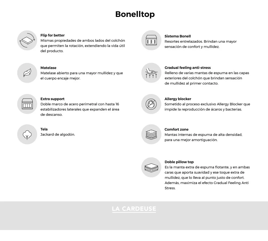 Un descanso reparador es la clave para disfrutar de un amanecer placentero. La Cardeuse Bonelltop brinda noches repletas de dulces sueños. Creado con materiales de calidad, asegura una experiencia saludable y duradera.