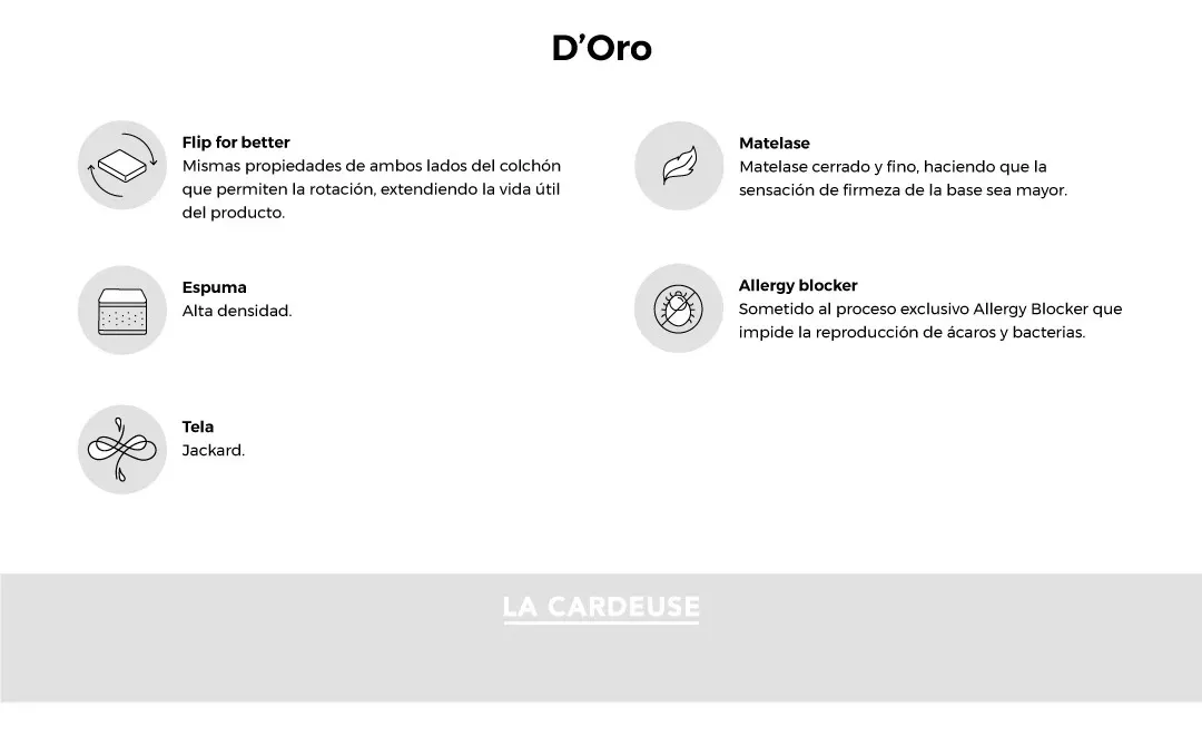 – Incorpora la tecnología Flip For Better, exclusiva de La Cardeuse, que le brinda al colchón las mismas propiedades de ambos lados y permite rotarlo. De esta manera el colchón se desgasta menos, más lento y de forma pareja, extendiendo su vida útil y brindando un descanso superior. Para facilitar esto cuenta con 4 manijas laterales reforzadas.