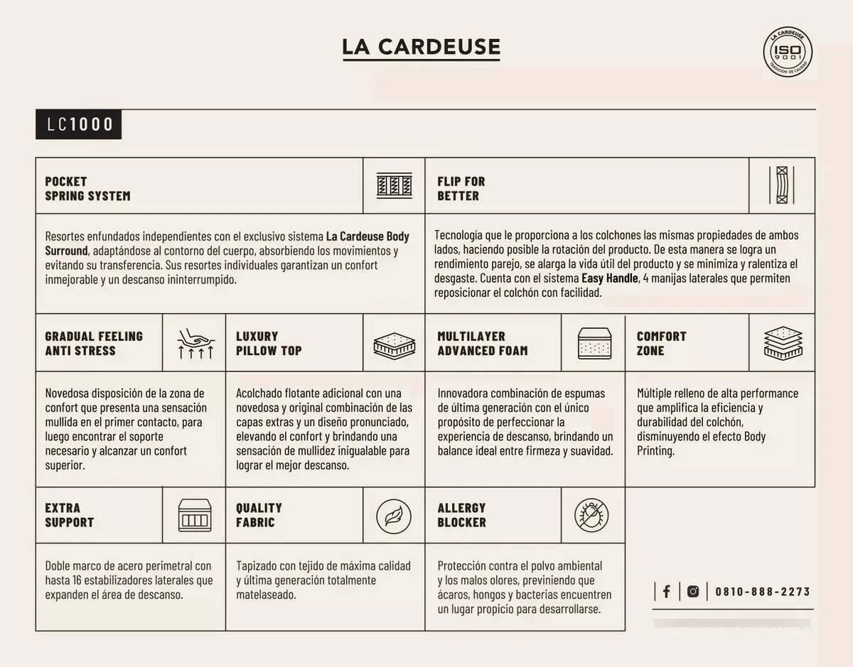 Este colchón es la gama más alta y más completa en resortes individuales. Hasta 1000 resortes de acero templado de máxima elasticidad envueltos de forma individual le otorgaran una amortiguación perfecta logrando un placentero descanso sin interrupciones. Cuenta con el sistema La Cardeuse Body Surround el cual permite que el colchón se adapte al contorno del cuerpo absorbiendo al máximo la transferencia de movimientos.